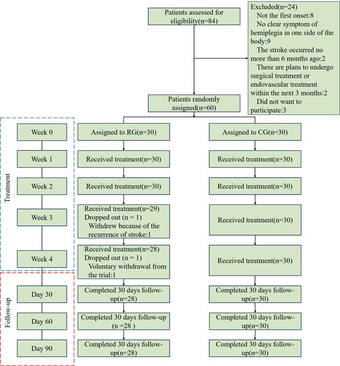 A prospective, single-center, parallel randomized controlled trial was designed in a clinical setting, including outcome measurements at baseline before intervention, after intervention, and at each follow-up node. After enrollment, patients were randomly divided into two groups: the RAS treatment group (RG) and the control group (CG). RG received 30 minutes of individual treatment per day for a total of 20 treatments (5 days a week for 4 weeks). CG received 30 minutes of conventional treatment training per day for 20 treatments (5 days a week for 4 weeks). Follow-up evaluations were conducted at 30 days, 60 days, and 90 days after the end of intervention. Researchers screened candidates for the study, and diagnoses and guidance were provided by experienced doctors from the Department of Neurology and Rehabilitation Medicine.