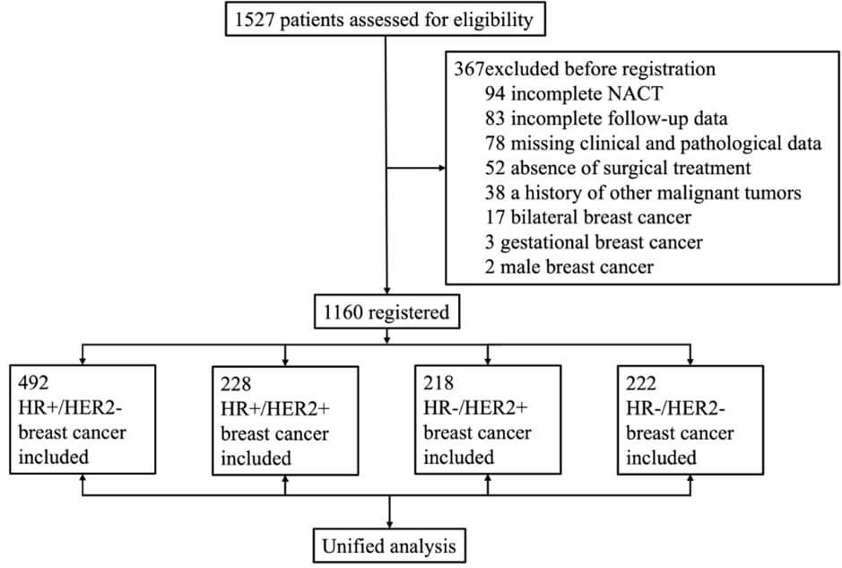 This is a multicenter retrospective study conducted at three hospitals in China, namely, the First Hospital of China Medical University, the Affiliated Zhongshan Hospital of Dalian University, and the First Affiliated Hospital of Jinzhou Medical University. This study included 1,527 patients aged 22-82 years with stage II-III breast cancer (2016-2023). Hormone receptor (HR) and HER2 status were defined per ASCO/CAP guidelines. All patients had undergone computed tomography (CT) scans of the head, lungs, and abdomen to exclude distant metastases. A total of 367 patients were excluded on the basis of the following criteria: incomplete completion of six cycles of NAT (n = 94); absence of surgical treatment (n = 52); male breast cancer (n = 2); gestational breast cancer (n = 3); bilateral breast cancer (n = 17); a prior diagnosis of other malignant tumors (n = 38); incomplete follow-up data, including follow-up durations shorter than one year (n = 83); and missing clinical and pathological data (n = 78) (Figure 1).