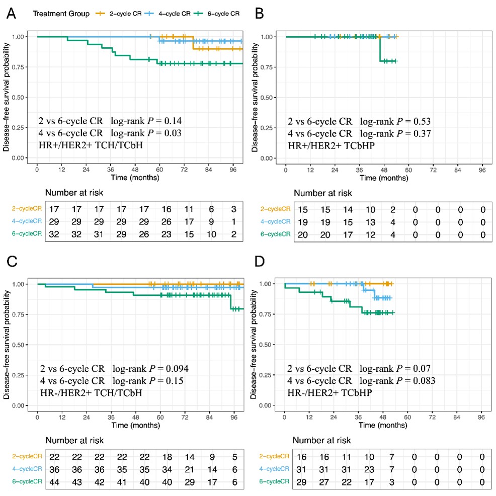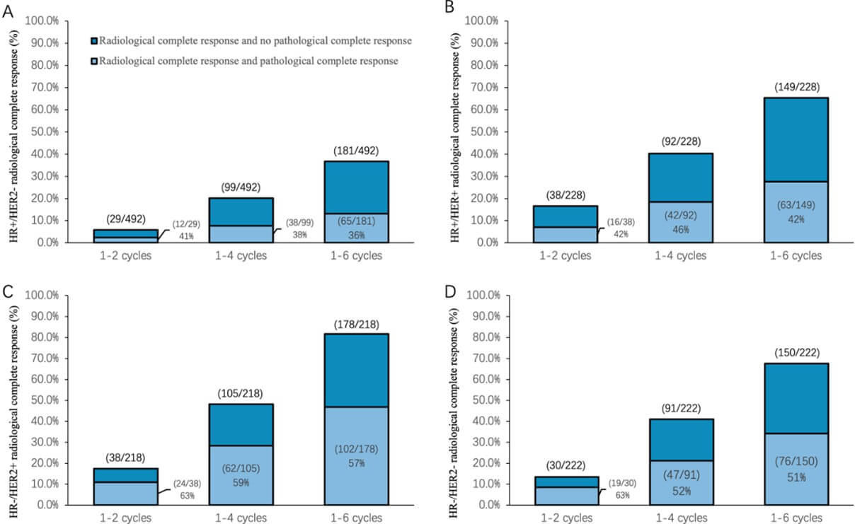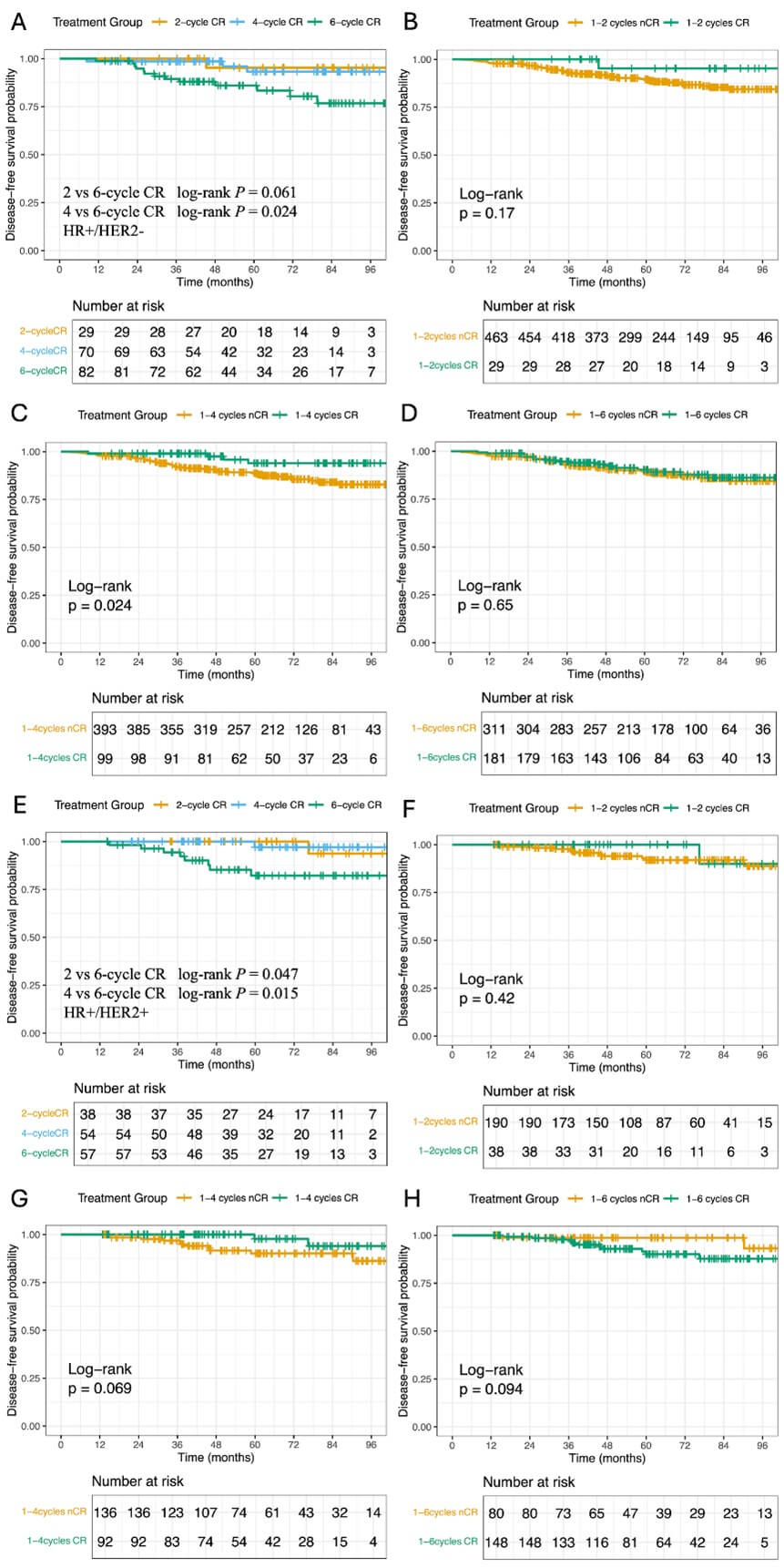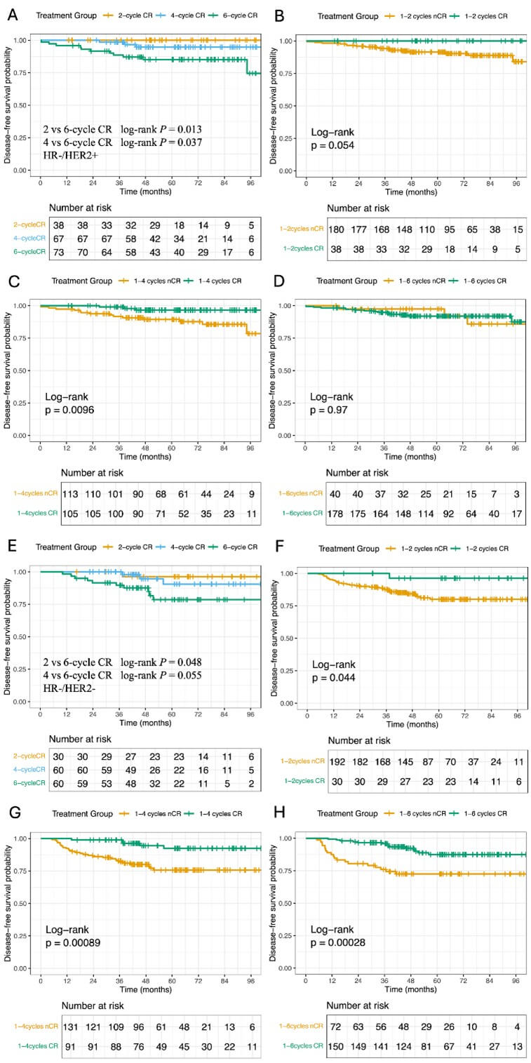 Results: In HR-/HER2+ patients, early radiological CR (≤4 cycles) was associated with superior DFS compared to late CR (8-year DFS: 2 vs. 6 cycles: P = 0.013; 4 vs. 6 cycles: P = 0.037). Other subtypes demonstrated similar trends for DFS. HR-/HER2- patients achieving radiological CR at 2 cycles had better outcomes than those with late CR (8-year DFS: 2 vs. 6 cycles: P = 0.048). The pCR rate was highest in HR-/HER2+ patients.